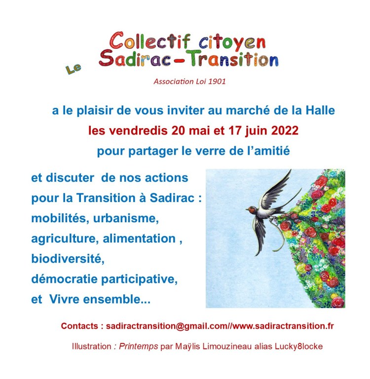 Nous sommes à un tournant dans notre commune : si nous voulons une commune vivable pour tous et toutes demain et dans le futur, nous devons opérer un tournant dans nos pratiques individuelles et collectives. Il y a urgence démocratique, écologique et sociale. Notre Collectif citoyen sadiracais adhère à la démarche nationale du "Pacte pour la Transition, Construire ensemble les communes de demain" créé à l'initiative de plus de cinquante associations nationales. Pour plus d'information consulter pacte-transition.org Notre Collectif local pour la Transition souhaite créer une dynamique à Sadirac où citoyens et élus contribuent ensemble à l'élaboration des décisions qui organisent le bien vivre à Sadirac et tiennent compte de l'urgence des enjeux climatiques et sociaux.