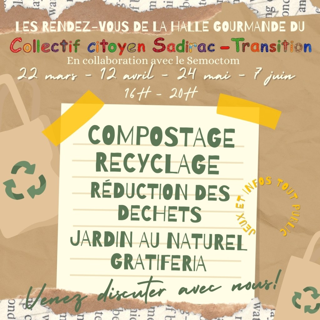 Le Collectif citoyen Sadirac-transition a tenu un stand les 22 mars, 12 avril, 24 mai et 7 juin 2024, en partenariat avec le Semoctom, au marché de Sadirac du vendredi (16h-20h), sur les thématiques du compostage, du recyclage, de la réduction des déchets et du jardin au naturel.