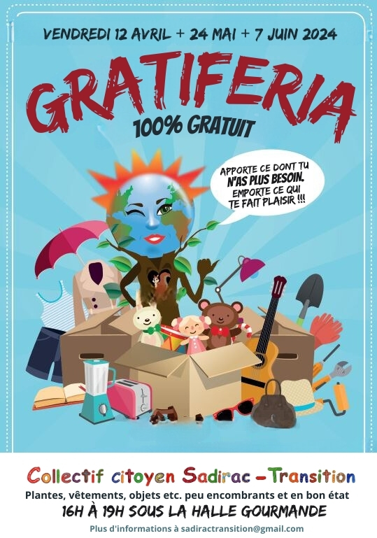 Nous y avons présenté des informations ainsi que des jeux pour petits et grands. Une gratiferia a également été installée, dont le principe, basé sur la gratuité, est d’apporter des plantes, vêtements, objets, etc (peu encombrants et en bon état) dont on n’a plus besoin et d’emporter ce qui nous fait plaisir.
