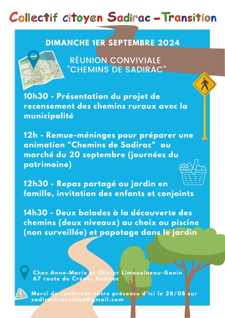Le dimanche 1er septembre, les adhérents ont été invités à une réunion de restitution et de travail au sujet du recensement des chemins ruraux de la commune effectué par 2 membres du Collectif. Des conjoints et enfants nous ont rejoins à partir de midi pour un repas partagé.