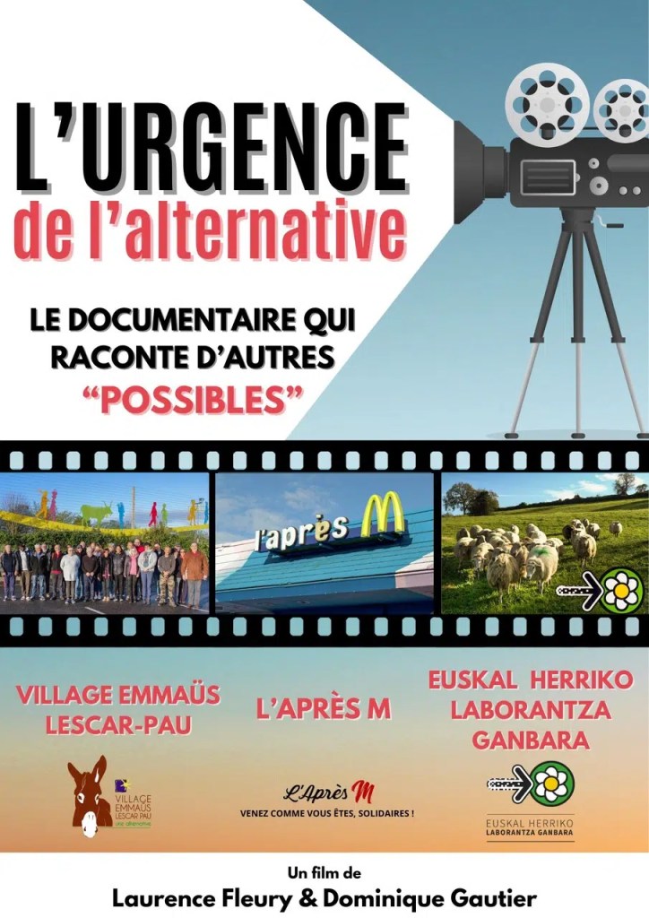 20h30 (durée 56 minutes) – Projection du documentaire « L’urgence de l’alternative » de Laurence FLEURY et Dominique GAUTIER qui raconte d’autres “possibles” enthousiasmants autour de l’alimentation. C’est l’histoire de trois défis pour mieux vivre ! Trois alternatives au « système » (urbaine, agricole, économique et sociale) expérimentées à Marseille, au Pays Basque et en Béarn. Un film qui donne envie d’agir et s’y mettre à son tour !