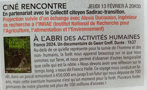 76 personnes ont assisté à la projection et au débat qui a suivi, animé par Alexis Ducousso. Ce fut aussi l’occasion pour le Collectif d’expliquer sa démarche face aux coupes massives qui ont lieu depuis 2 ans dans la forêt privée de Sadirac.