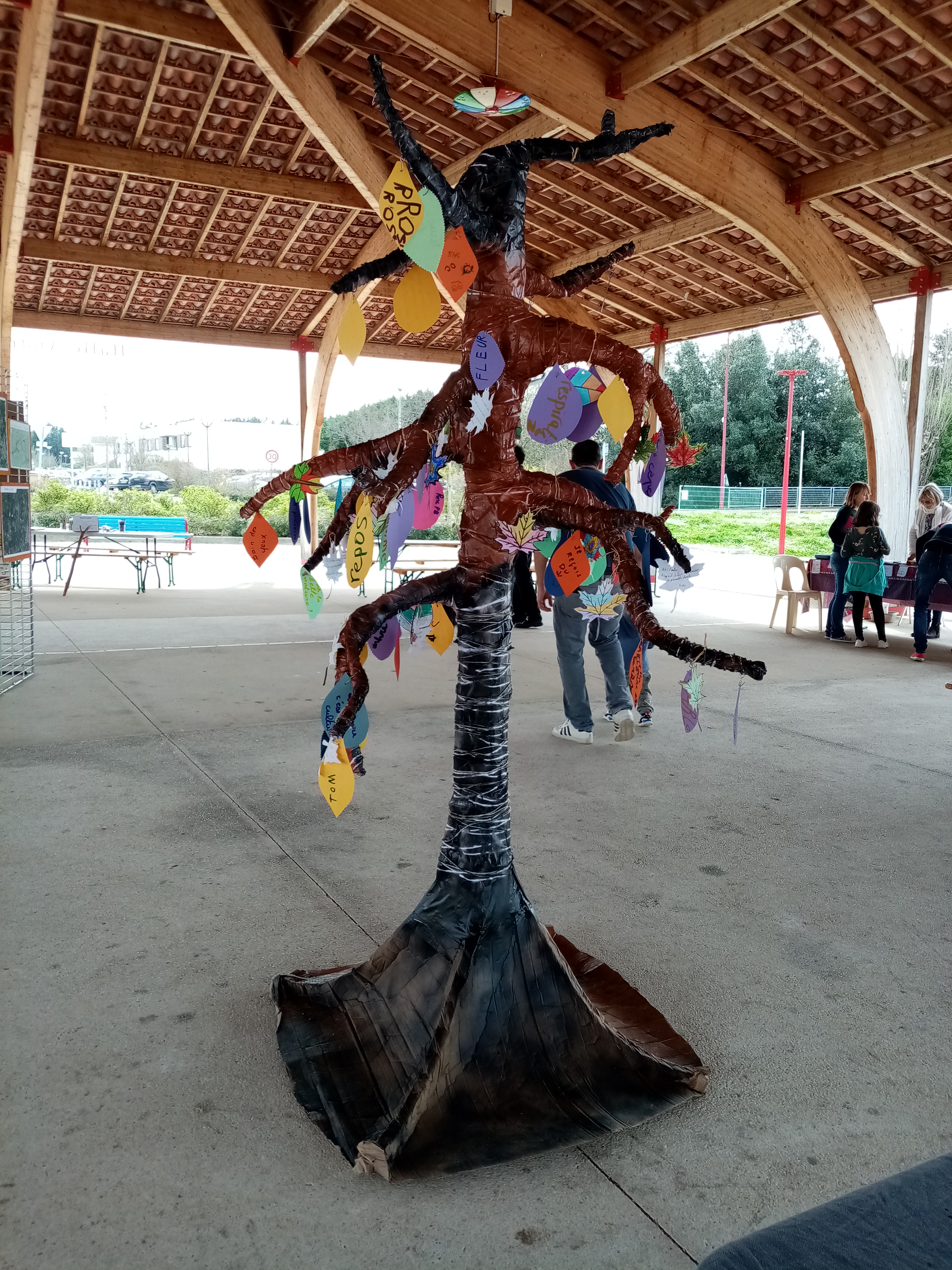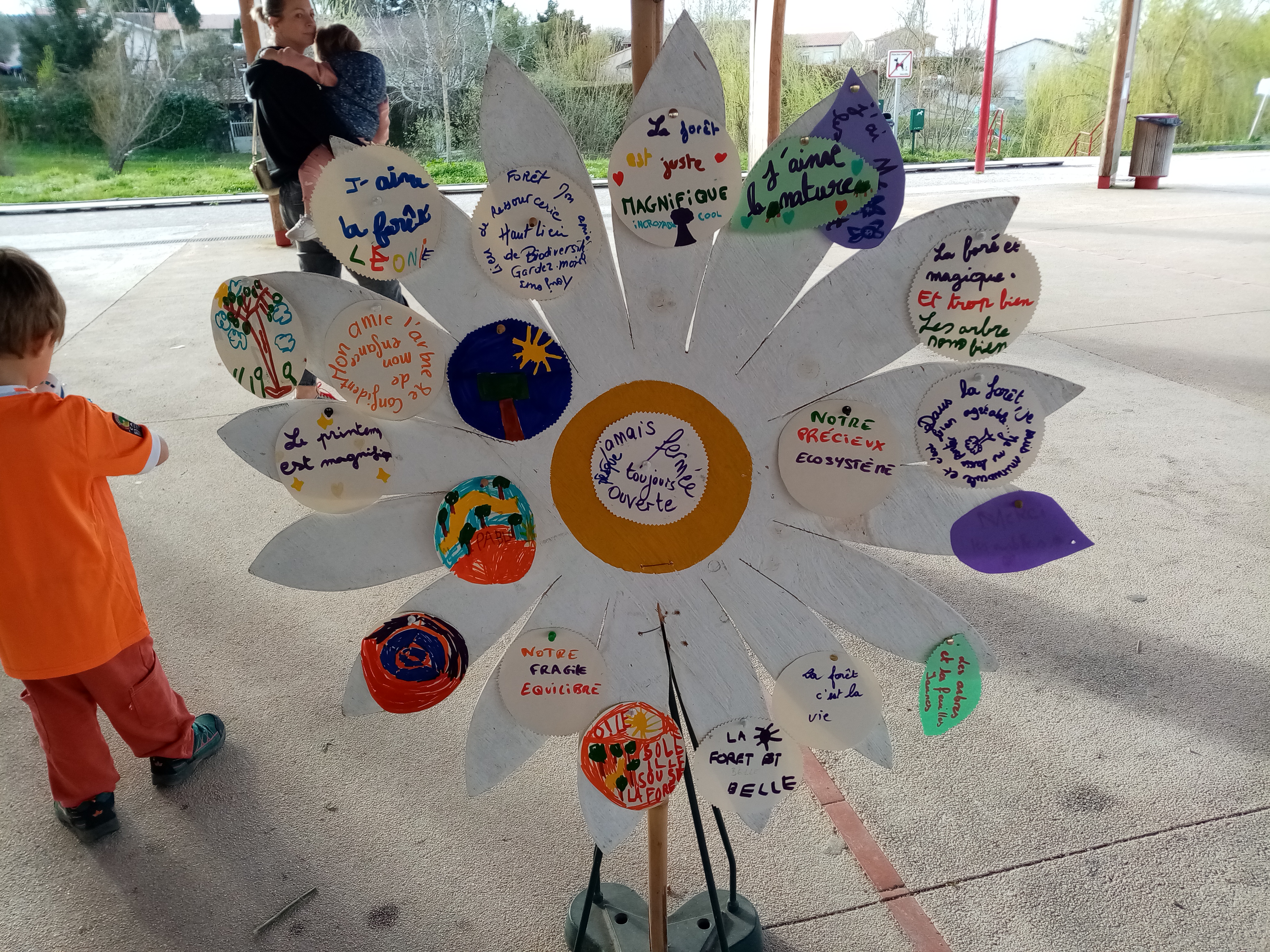 Les élèves d’une classe de CE2 du bourg ont déclamé leurs haïkus, un arbre à palabres et une marguerite géante ont recueilli les mots des uns et des autres sur ce que leur évoque la forêt et les arbres et le public a pu réaliser des mandalas avec des végétaux récoltés par les scouts d’Amitié scouts Aquitaine.